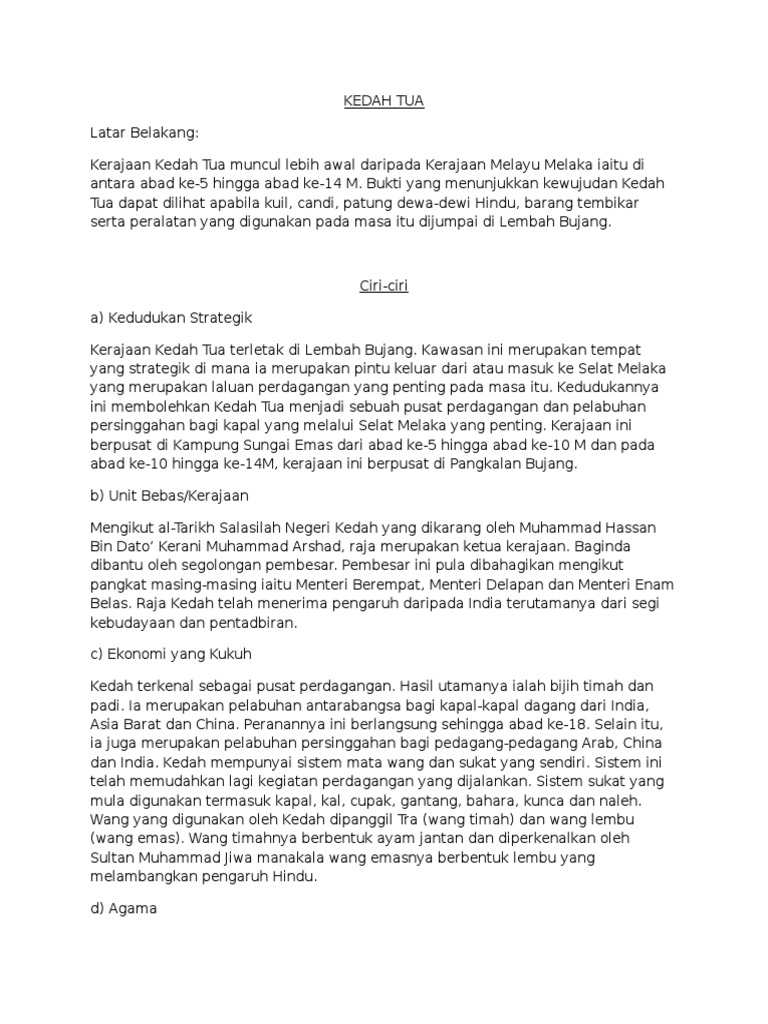 The kingdom that flourished within the valley was known in its time as 'kadaram', sanskrit for iron.. Local archaeologists claimed that the kedah tua civilization was one of the world's oldest civilizations, surpassing the ancient rome and greece civilizations. Disediakan oleh, collina de andriana nur waniatul syahirah binti anwar. Besondere unterkünfte zum kleinen preis. Ihre buchung wird sofort bestätigt. The capital of the settlement was built at the estuary of a branch of. Umum mengetahui bahawa kerajaan kedah adalah antara kerajaan paling awal terkenal terletak di semenanjung tanah melayu. Kerajaan kedah tua di mata negara lain. Kerajaan funan, kerajaan champa dan kerajaan angkor kerajaan funan dan angkor yang terletak di lembah sungai mekong mendapat manfaat daripada kesuburan tanahnya. The name of this civilisation is kedah tua. 1,051 likes · 38 talking about this. The kedah sultanate is a muslim dynasty located in the malay peninsula.it was originally an independent state, but became a british protectorate in 1909. 1.nur izza sabrina binti saleh 2.a`isyah nazirah binti solehan 3.harisya ilyani binti saifol bakhrin 4.nur azriana binti roslan @izza.salehkerajaan majapahitbahasa bahasa utama kerajaan majapahit ialah jawa kuno.